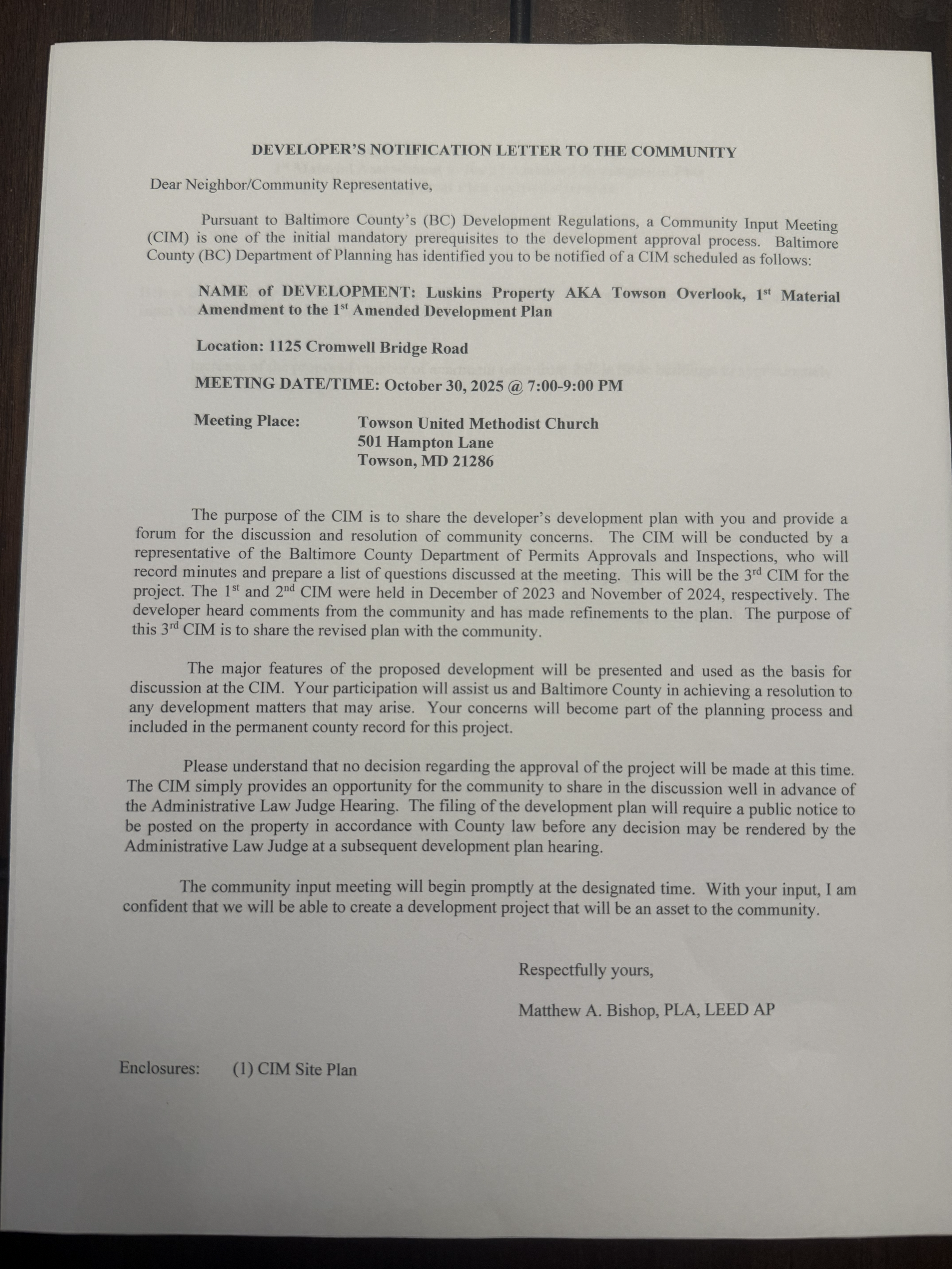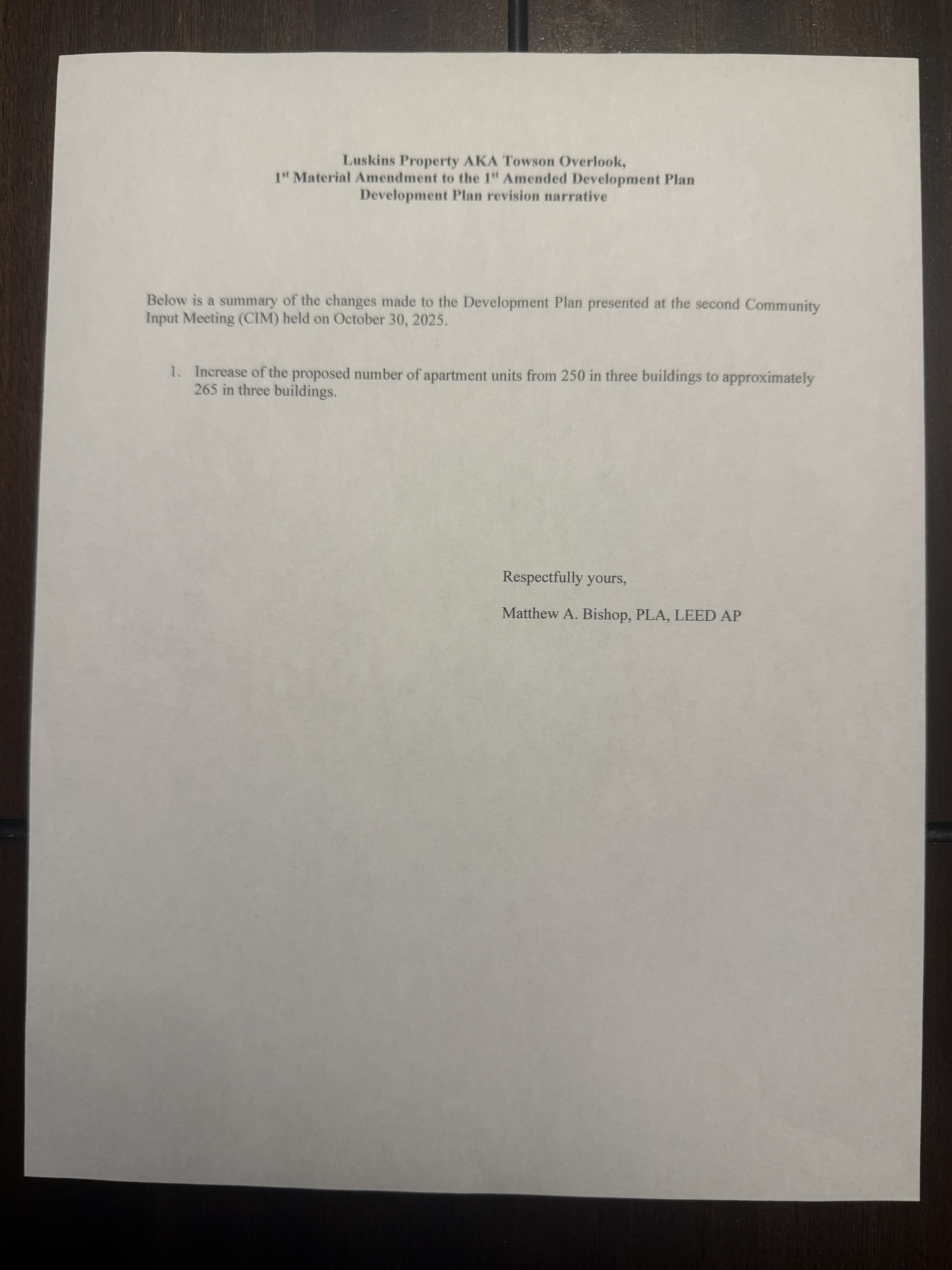 A Community Input Meeting regarding the proposed Towson Overlook project is scheduled for Thursday, October 30, 2025. The amendment to the project notes a plan to increase the apartment units from 250 to 265.